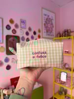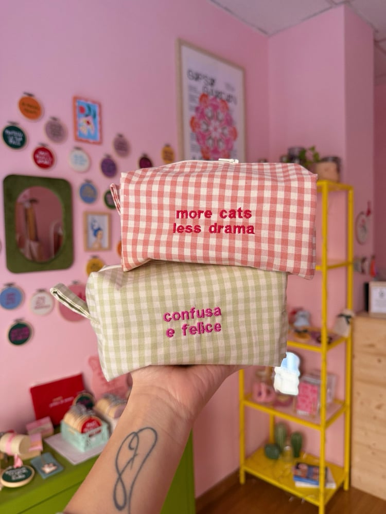 Pratico, unico e originale: questo beauty case è realizzato interamente a mano e impreziosito da un ricamo artigianale con la scritta “Confusa e felice”.