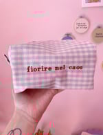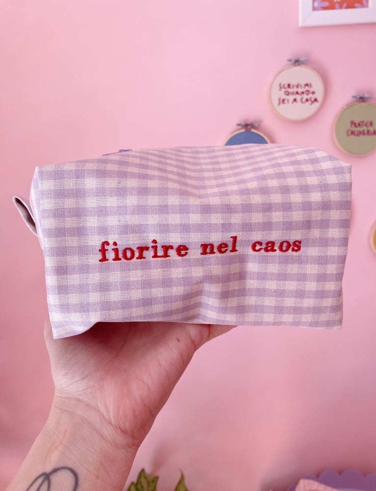 Pratico, unico e originale: questo beauty case è realizzato interamente a mano e impreziosito da un ricamo artigianale con la scritta “Fiorire nel caos”.